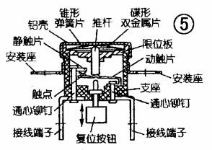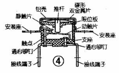 Snap action bimetal thermostat temperature controller is divided into open type (common structure as shown in Figure 3) and sealed type. The sealed type bimetallic thermostat is divided into automatic reset type (structure as shown in Figure 4) and manual reset type (structure as shown in Figure 5). All kinds of snap action bimetal thermostat models collectively known as KSD, temperature is graded set value, can not be adjusted. The working principle of automatic reset type snap action thermostat is to make bimetallic disc into dish-shaped element, generate displacement energy accumulation when heated, once overcome resistance reverse jump, push the push rod to make contact quickly break, automatically disconnect the circuit; When the temperature drops, the bimetallic disc jumps back to the original state, so that the contact is closed, and the circuit is automatically switched on, so as to achieve the purpose of temperature control.